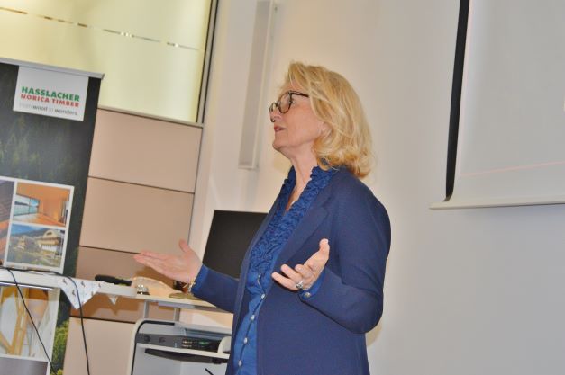„Wir haben seit 120 Jahren Dinge immer wieder anders gemacht als die anderen, auch bei diesem Bau“, so Georg Jeitler, Leiter der Forschung und Entwicklung des Gastgebers HASSLACHER im ersten Impulsbeitrag des Nachmittags. Er zeigt das eindrucksvolle HOHO Wien, das Holz-Hochhaus, das zweithöchste Holzgebäude der Welt, 84 Meter und 24 Geschoße hoch. Ob durch fugenfreie Holzoberflächen oder Holzelemente, in denen Fenstereinheiten eingebaut geliefert werden, das holzverarbeitende Unternehmen setzt mit vielfältigen Innovationen Akzente am Markt.